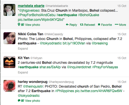 It’s now been ten days since Bohol’s tragic earthquake in which at least 198 people have died, both within and beyond the island. I watched the tragedy unfold on social media from a safe distance and after ascertaining that all my friends and colleagues are safe I’ve had space to reflect on how the tragedy is being processed by Boholanos. We have all become accustomed to the truism that social media is well suited to disaster situations when—constraints on electricity and networks notwithstanding—individuals can share vital information in a way that is fast, relevant and decentralised. But as an outsider I was baffled, and a little angered, by how Filipino social media became saturated with images of ruined churches and desperate appeals for prayer. I couldn’t help being left with the impression that an almost hysterical cycle of conspicuous piety was drawing attention away from more pressing human needs. Which towns and villages were most affected? What roads and bridges were still open? Where were resources, money and volunteers needed?