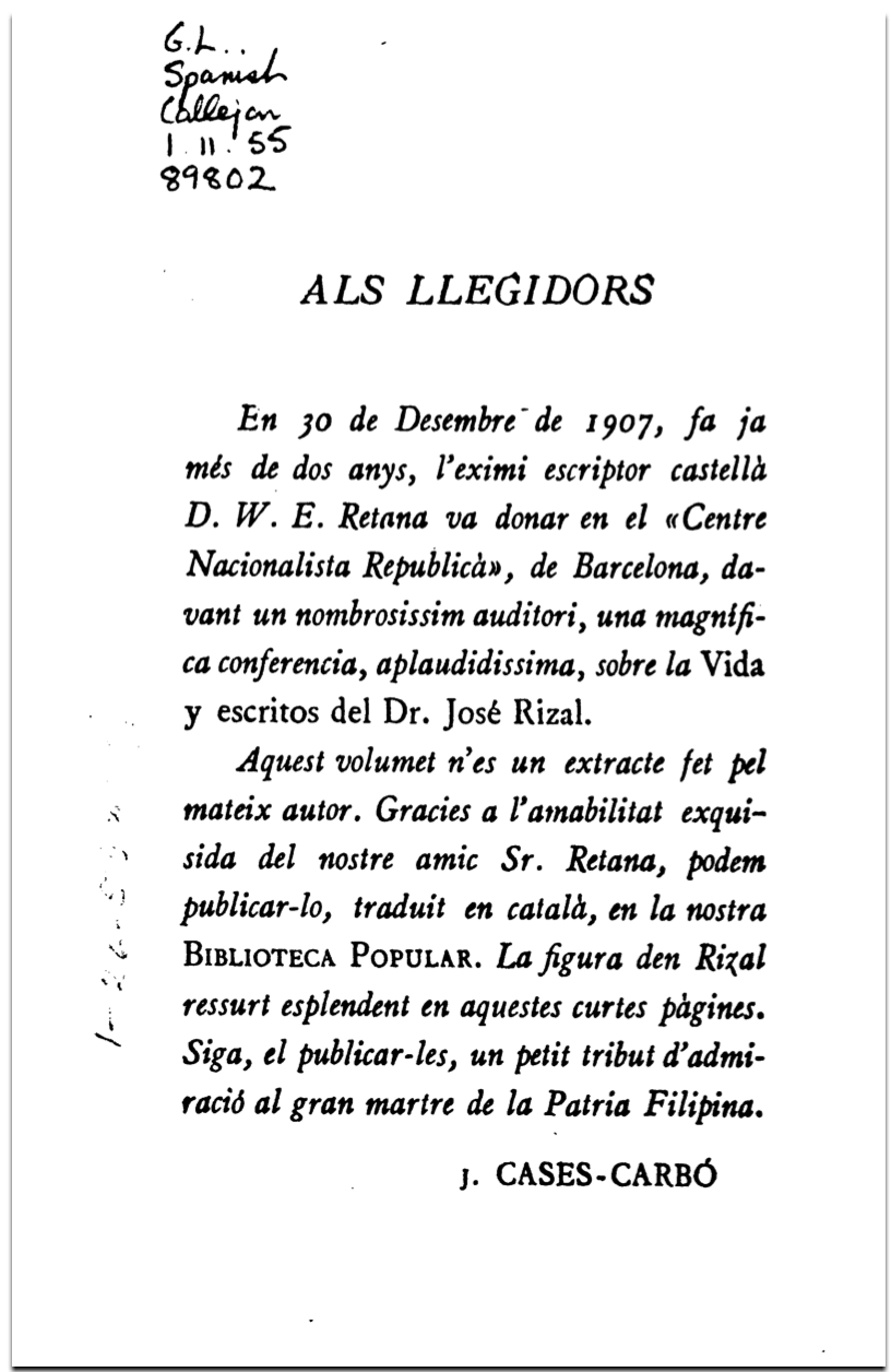This morning’s serendipitous discovery in archive.org is Wenceslao Retana’s biography of Jose Rizal in Catalan(!!), translated from the Spanish in 1910, three years after it was first published. The book doesn’t seem to display properly in archive.org but the pdf is downloadable. Enjoy!