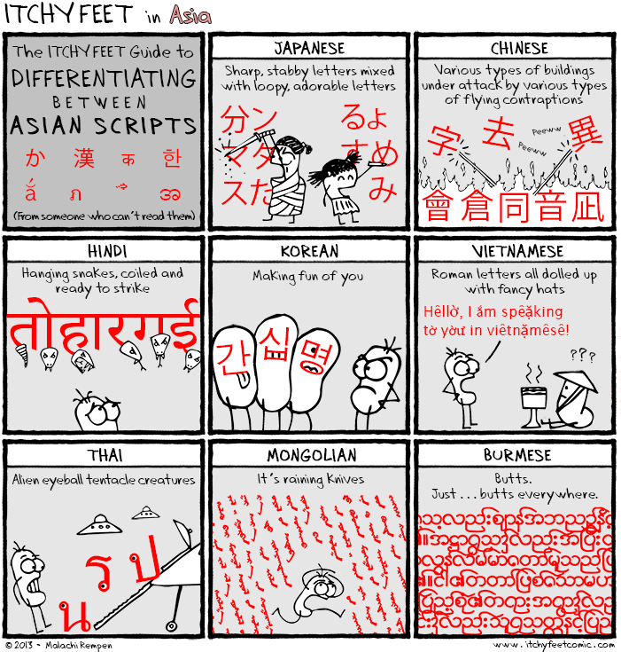 Writing systemsAsian scripts as a Rorschach test This cartoon is fun, from Itchy Feet: a travel and language comic from Malachi Rempen: Share this: Click to share on X (Opens in new window) X Click to share on Facebook (Opens in new window) Facebook Like Loading... Related Standard