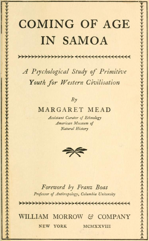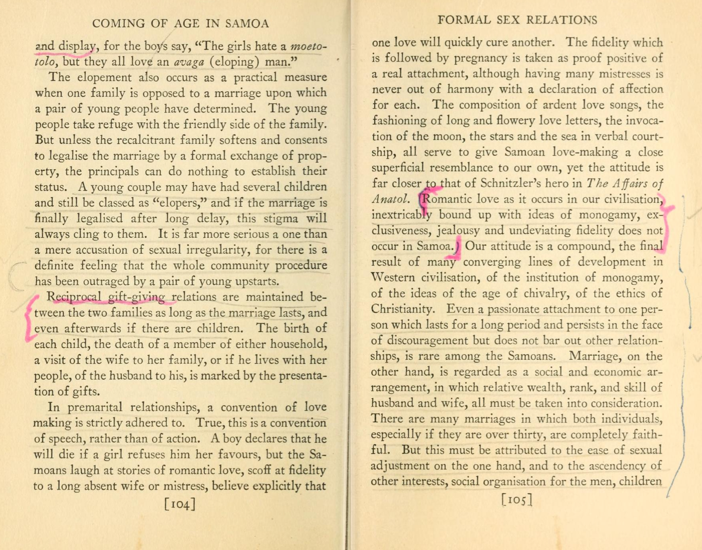 Recently posted to AASnet, a link to the first edition of the notorious Coming of age in Samoa (1928), now digitised by the University of California and available on the Internet Archive. This is a well-worn edition with lots of underlining and annotation by – presumably – numerous young scholars over the course of the twentieth century.
