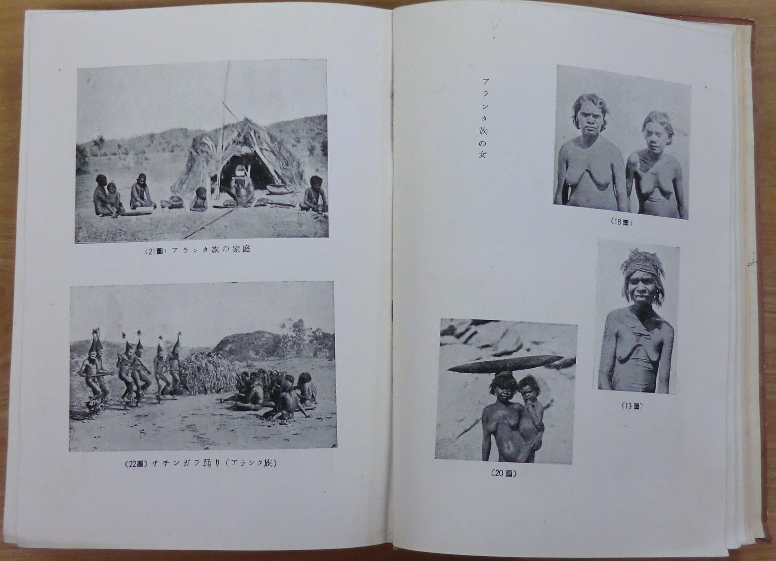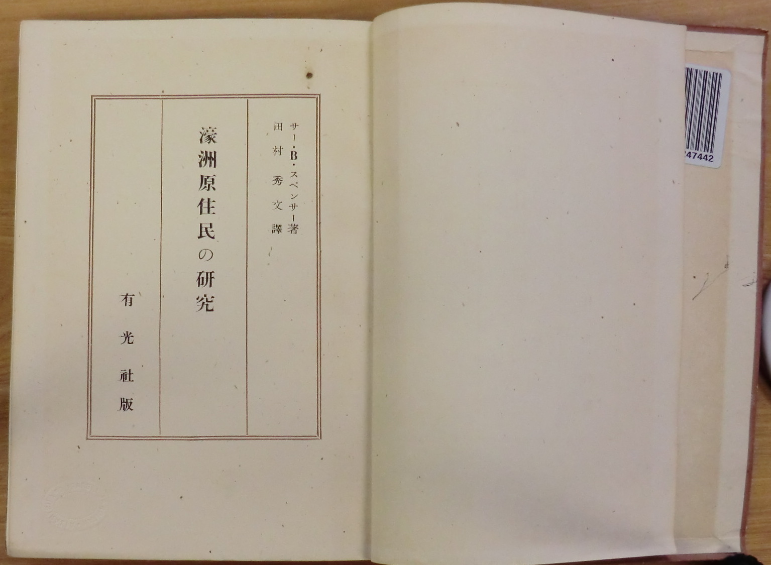 Above is a photograph of the title page. The NLA catalog renders this as Goshu genjumin no kenkyo/ Sa B. Supensa cho, Tamura Hidebumi yaku. I’m assuming ‘B. Supensa’ is Baldwin Spencer and that Tamura Hidebumi is the translator.