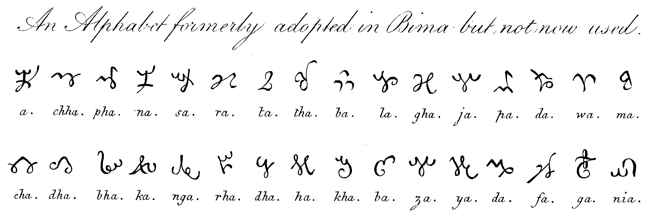 One possible 19th century invention is a script for Bima that I remembered seeing in Plates to Raffles‘s History of Java (1817). I tracked it down yesterday and made a high-resolution scan. Here it is: