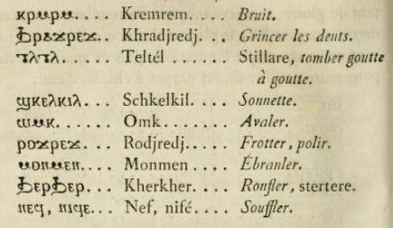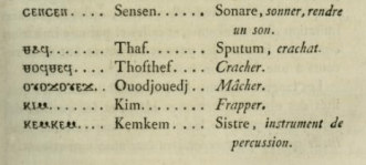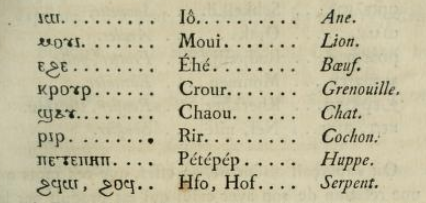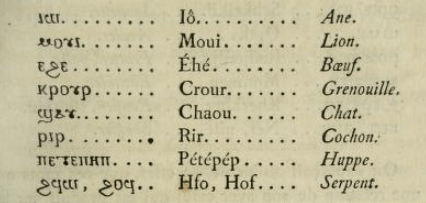 Instead he imagined that Egyptian society could only have achieved such a high degree of complexity because hieroglyphics represented spoken language. He did, however, speculate that iconicity was a necessary affordance in the early emergence of a communicative system such as language, and suggested that the iconicity of hieroglyphics had a counterpart in what he perceived to be the inherent iconicity of the Egyptian (ie, Coptic) language. By way of illustration he provided a short table of Egyptian animal names, apparently derived from the sounds that the creatures produce. The first column is Coptic, the second a Roman transliteration of it, the third a French gloss: