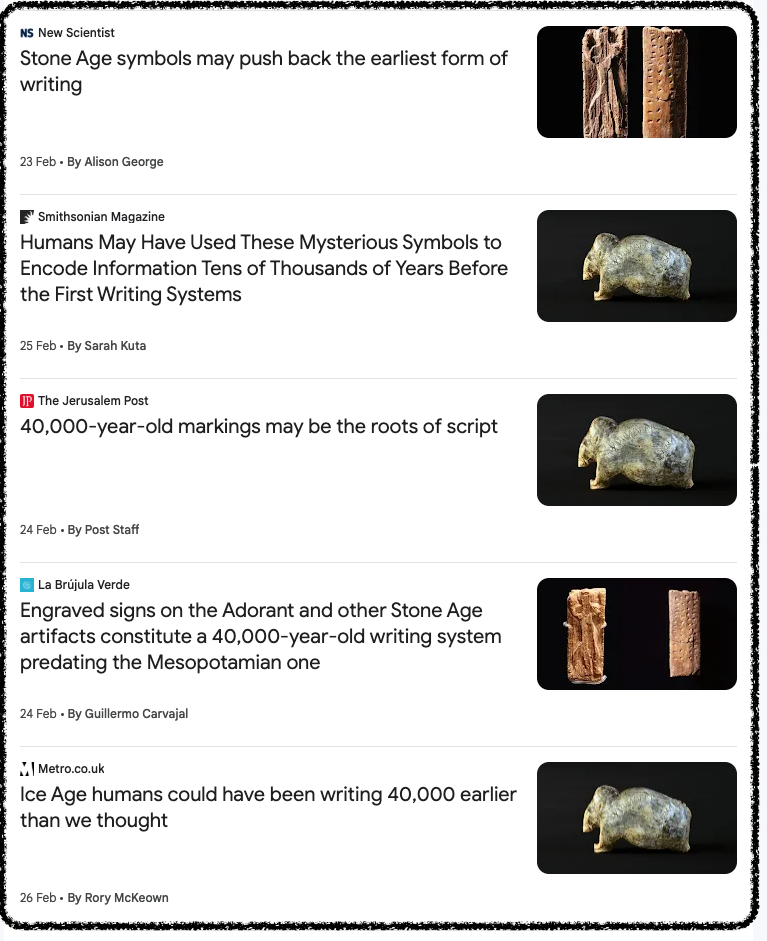 The authors dangle much more exciting implications within the paper itself without fully committing to them. Parenthetically they suggest that the findings shed light on the emergence and evolution of writing itself, as well as the incremental advancement of human cognitive potential. This discussion was clearly intended to provoke the curiosity of readers rather than to stake any defensible claim. But it is these remarks, rather than the findings, that have captured the imagination of journalists who prefer to tell a simpler story: that scientists have discovered a 40,000 year old ancestor to writing.