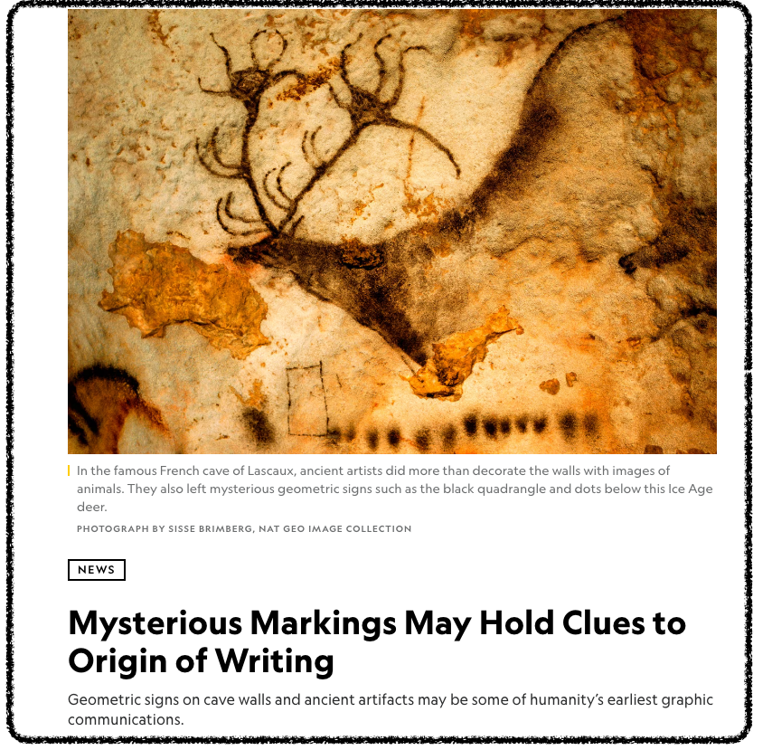 Anthropologists rejected that model of stepwise goal-directed evolutionism over a century ago, but not before it sank deep into public consciousness. It has proved very hard to compete with such a compelling story. No one is going to bother clicking on the headline “Scientists discover that human societies across history are wonderfully diverse and generate a range of responses to different circumstances, sometimes independently hitting on the same solution, sometimes by repurposing an older solution to a different problem.” Much better to run with “Ape creates bone tool that becomes space ship”. When it comes to ancient marking practices, readers can visualise early Europeans doodling on various surfaces in an effort to discover writing, much like a frustrated novelist scrunching up endless drafts and trying again, each draft getting closer to the desired effect.